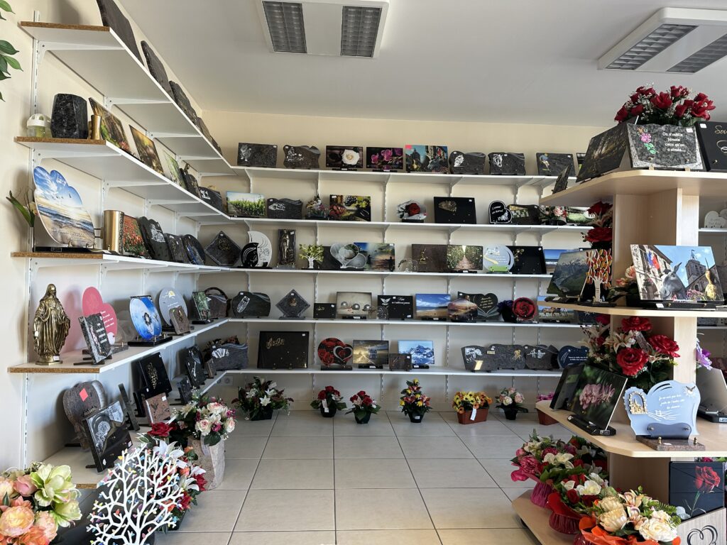 - – les articles : cercueil, capiton, urne, fleurs, plaques ;